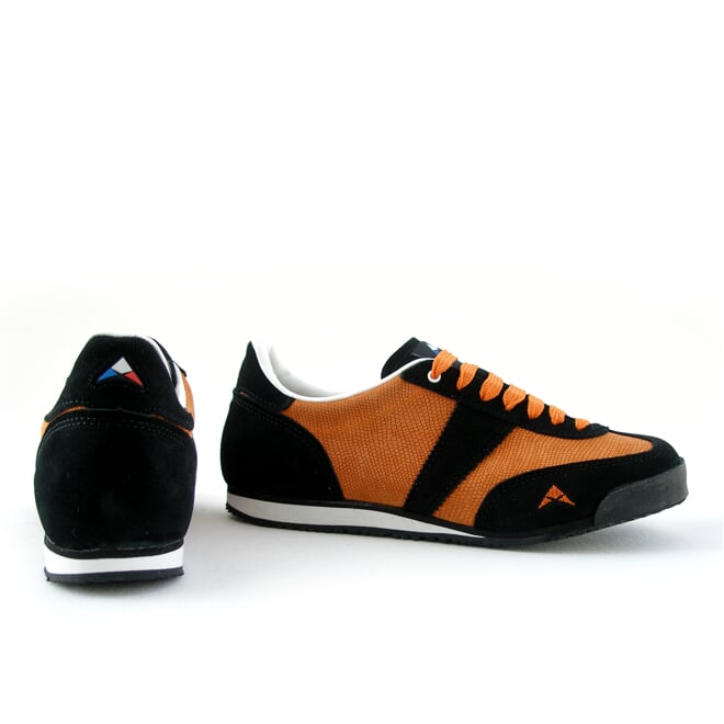 Celokožený svršek obuvi je kombinován z přírodních tlačených štípenkových a štípenkových usní v oranžovo-černém designu. Vnitřek obuvi tvoří odolný bílý syntetický materiál a anatomicky tvarovaná třívrstvá vyměnitelná vkládací stélka černé barvy s bílým potiskem grafického loga BOTAS AUTHENTIC. Odlehčená třívrstvá podešev s nižším dropem umožňuje unikátní kontakt s povrchem pod chodidly.